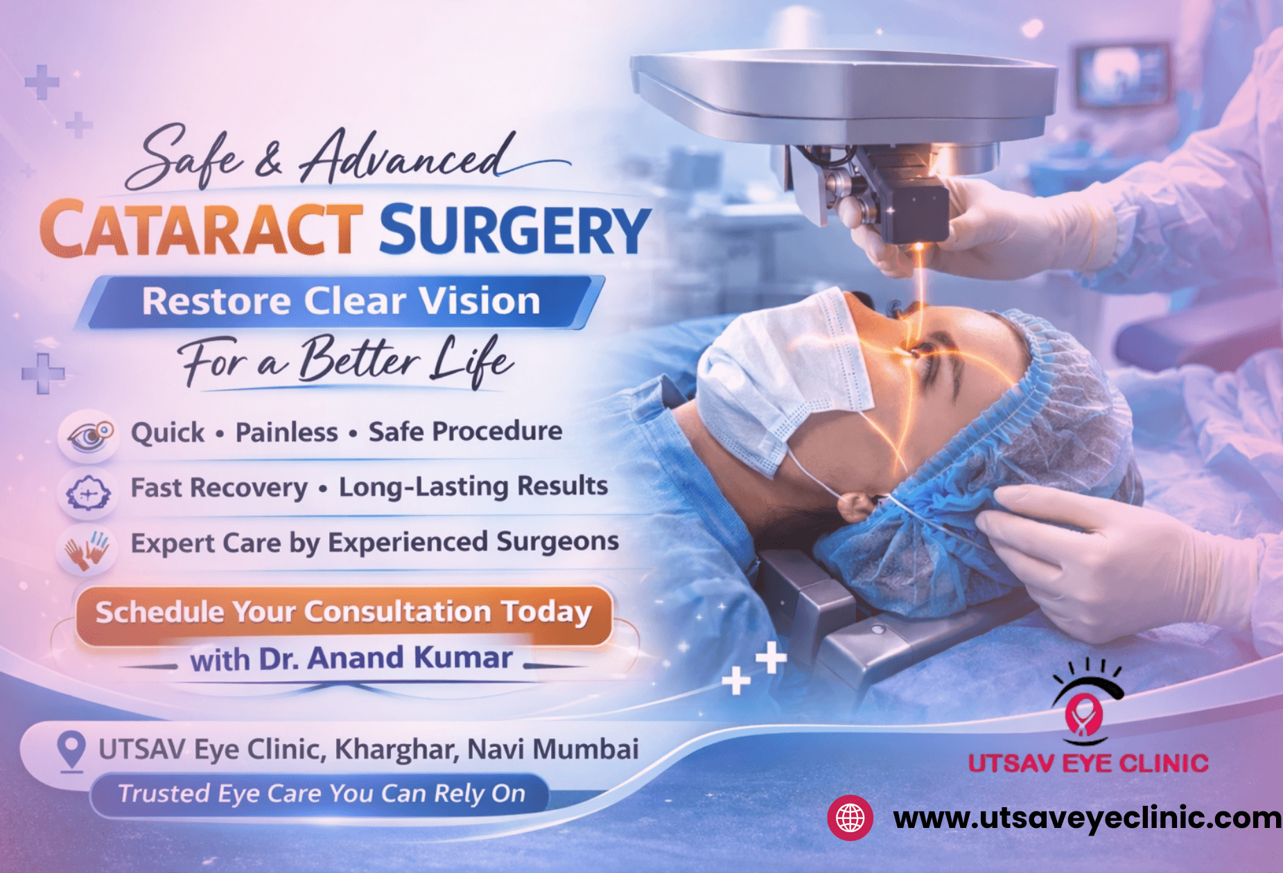 Postponing cataract treatment can gradually reduce visual quality and affect daily living. Early management improves safety, simplifies surgery, and speeds up recovery. At UTSAV Eye Clinic in Kharghar, led by Dr Anand Kumar, patients receive advanced laser cataract surgery along with compassionate, personalised care. Taking timely action helps preserve clear vision and maintain independence.